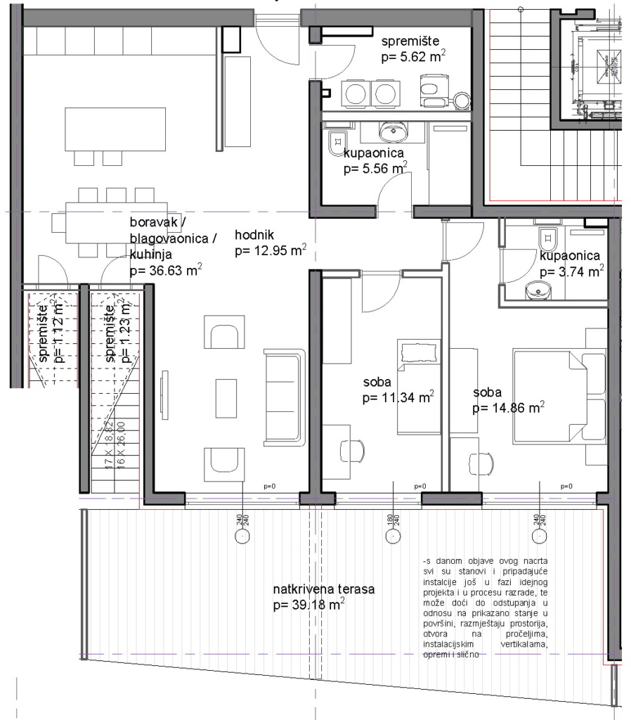 | 1. | D. boravak, blag., kuh. | 36,63 m² |